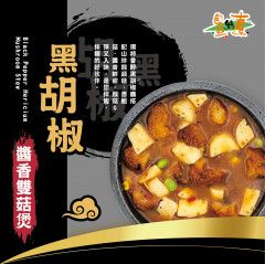 內容物:水、杏鮑菇、猴頭菇(水,乾燥猴頭菇,大豆分離蛋白,芥花油),素黑胡椒醬((水、切碎蕃茄(蕃茄、蕃茄汁)、醬油(非基改)、紅蘿蔔丁、蘑菇片、在來米粉、橄欖油、糖、大豆蛋白(非基改)、麵粉、蕃茄糊(蕃茄)、黏稠劑(磷酸二澱粉)、玉米澱粉、黑胡椒粒、焦糖色素(著色劑)、調味劑(L-麩酸鈉、胺基乙酸 、酵母抽出物)、鹽、海帶芽、乳化安定劑(刺槐豆膠、關華豆膠、三仙膠) 、香料)),玉米粒,毛豆仁,橄欖油,調味劑(L-麩酸鈉、胺基乙酸)。